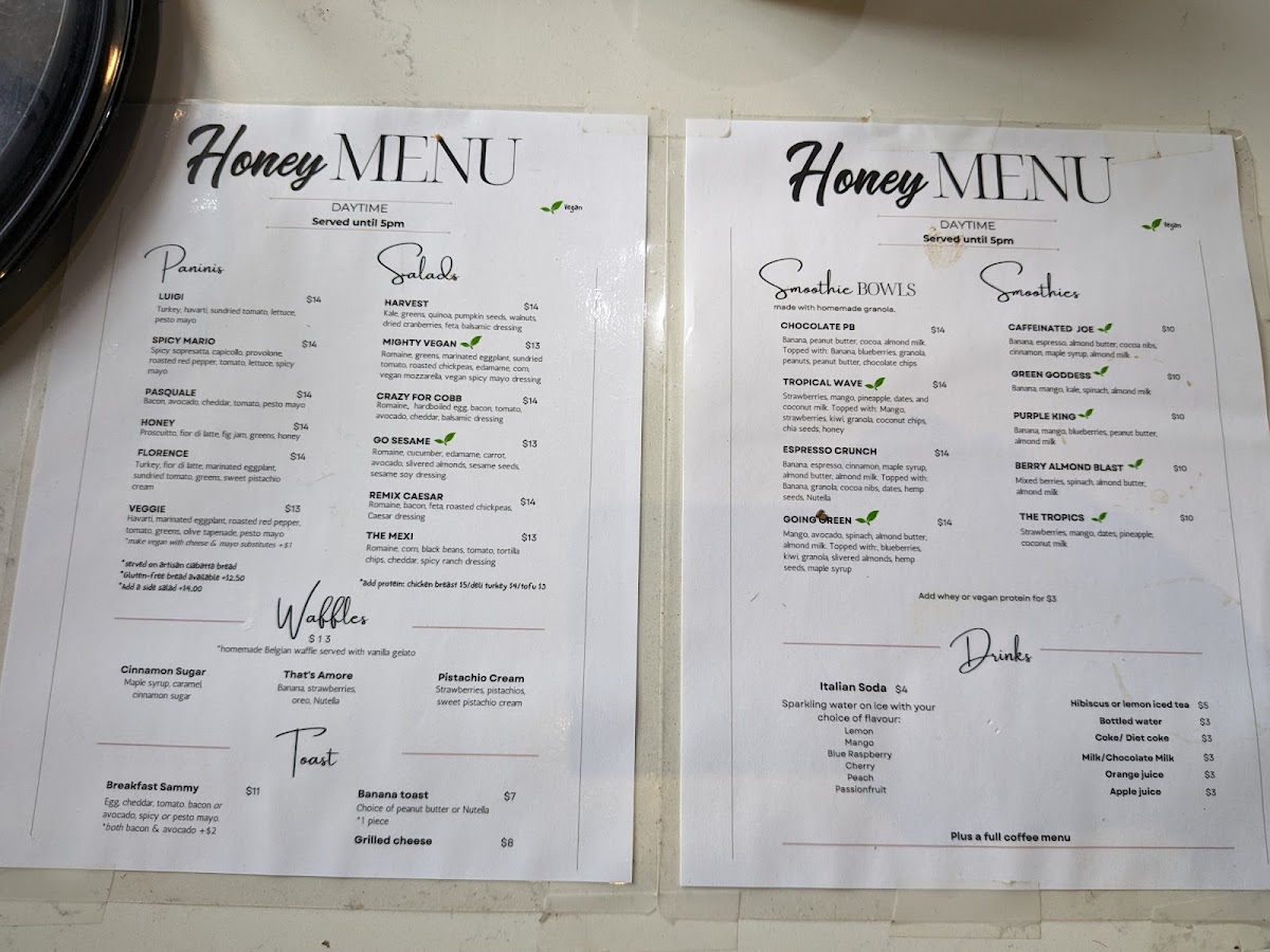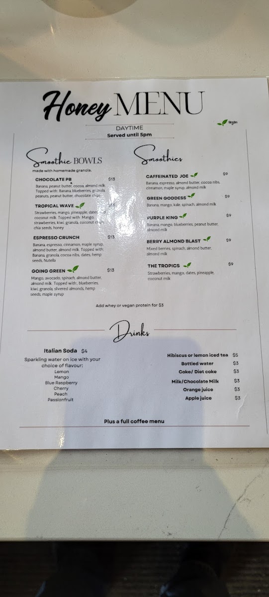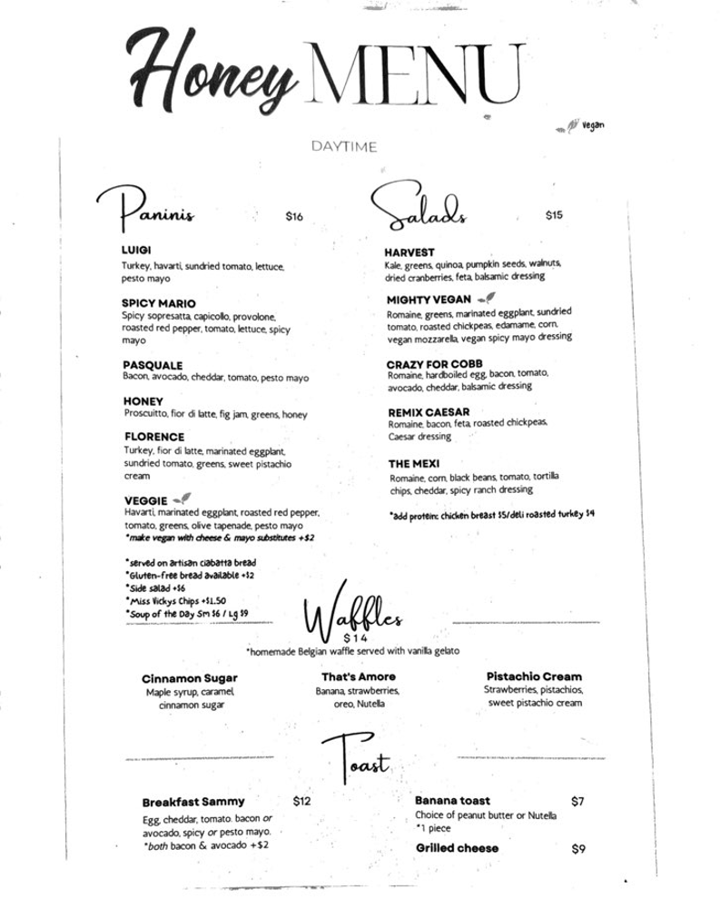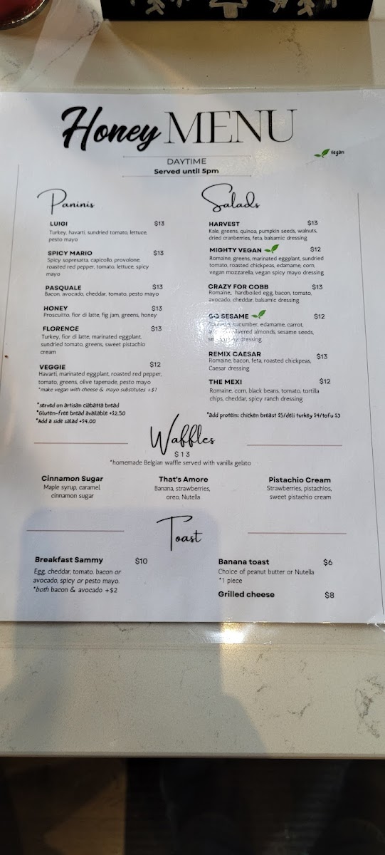 Honey Coffee Bar offers a delightful array of drinks, shakes, paninis, toasts, and more, perfect for any time of day. Their drink selection includes staples like Espresso, Espresso Macchiato, and Americano, catering to both traditional coffee lovers and those seeking a simple, bold cup. For something more refreshing, their Green Goddess shake offers a unique twist. The paninis are a highlight, with options like the Spicy Mario for those who like a little heat, the classic Pasquale, the hearty FlorenceHoney, and the lighter Veggie panini. Toast lovers will enjoy choices such as Grilled Cheese and the flavorful Breakfast Sammy, a comforting start to the day. For those craving something sweet, the menu offers treats like Cinnamon Sugar, That's Amore, and Pistachio Cream. Whether you’re in the mood for a savory snack or a sweet indulgence, Honey Coffee Bar has something for everyone.